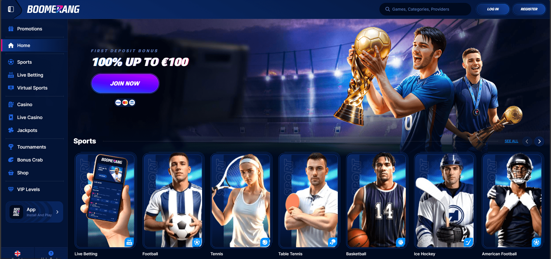 BoomerangBet Casino wurde 2023 gegründet und ist Eigentum der Casbit Group N.V., einem Unternehmen mit umfangreicher Erfahrung in der iGaming-Branche, und wird von ihr betrieben. Zu den Schwesterseiten von BoomerangBet Casino gehören unter anderem OxBet Casino, Justbit Casino und Lalabet Casino. Was die Sicherheit betrifft, ist BoomerangBet Casino lizenziert und unterliegt den Regeln und Vorschriften von Curacao, was bedeutet, dass die Sicherheit kein Problem darstellt. Neu registrierte Spieler werden sogar mit einem 100 % Sport-Willkommens-Einzahlungsbonus von bis zu 500 € begrüßt.